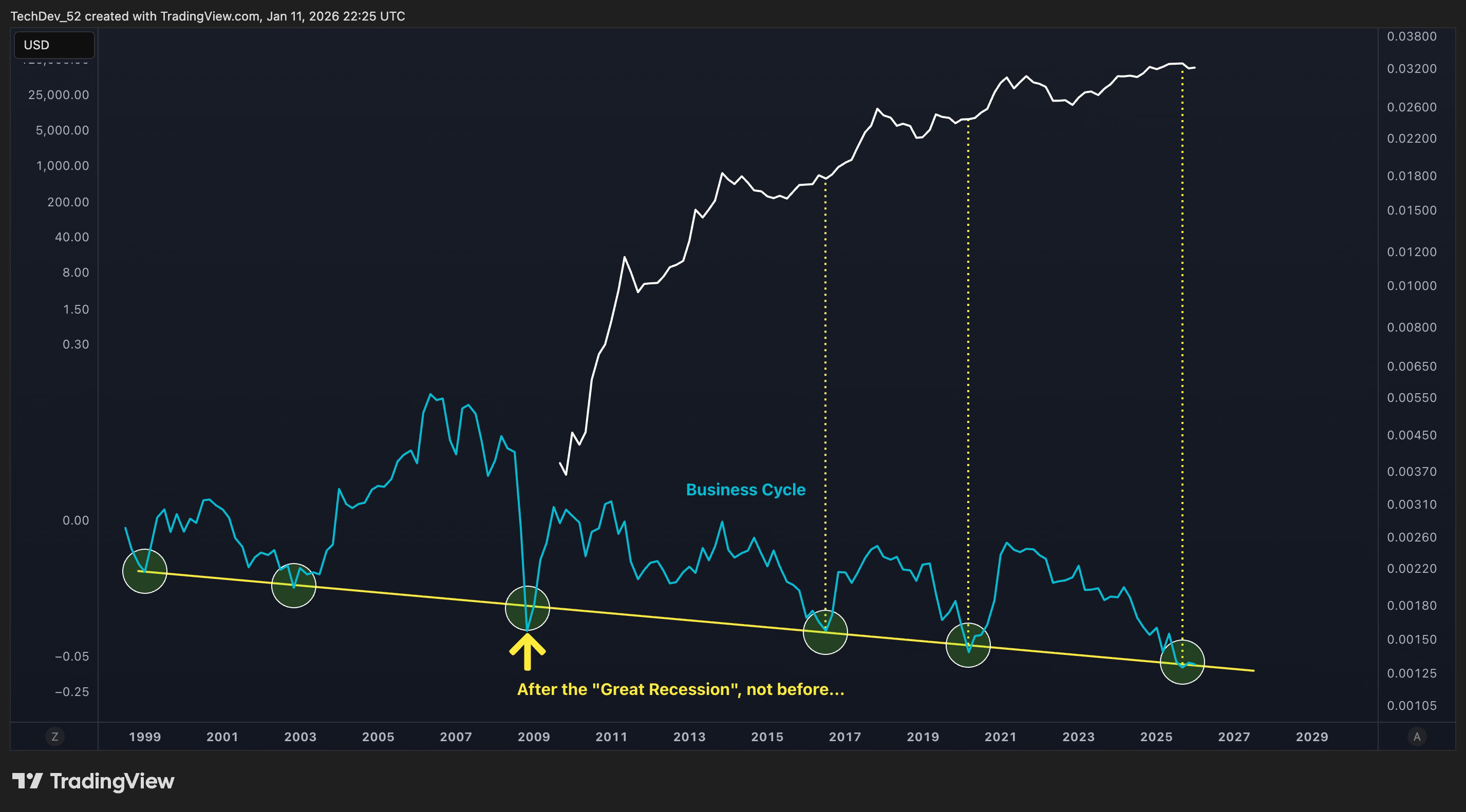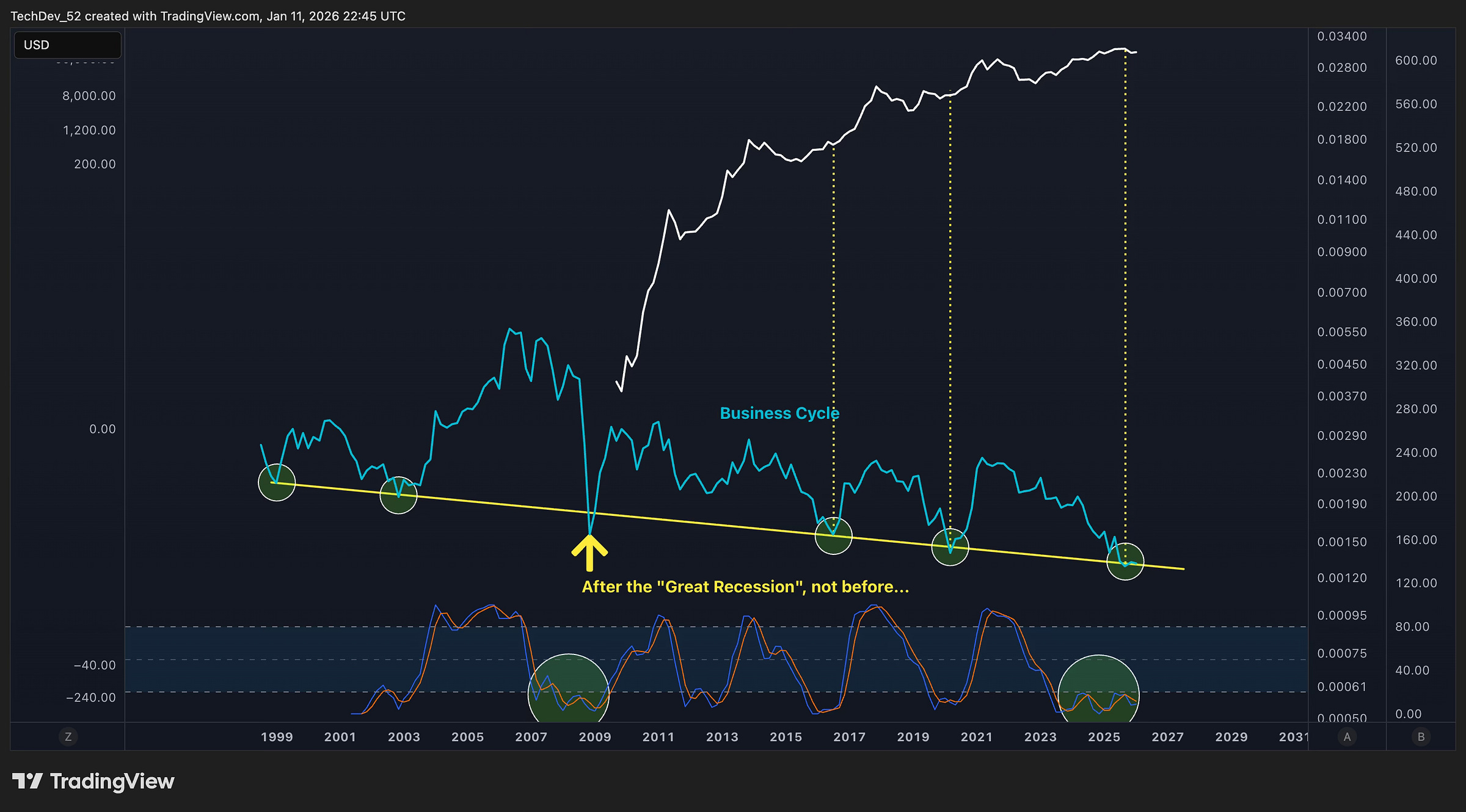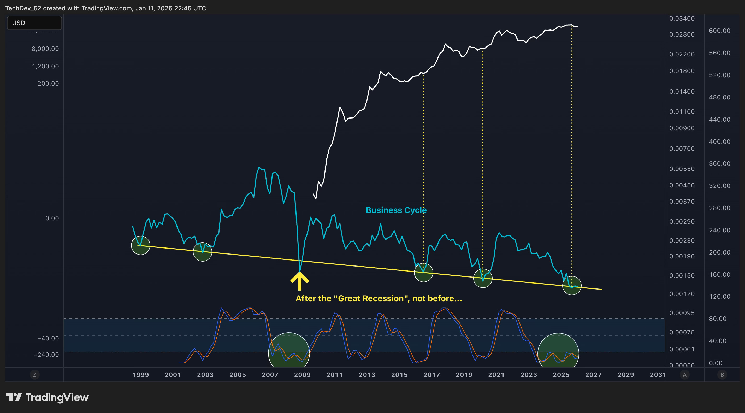 The green circles at the bottom of the chart highlight the Stochastic RSI bottoming zones. Notice the pattern: these momentum troughs have aligned with the same business cycle bottoming levels we just examined.