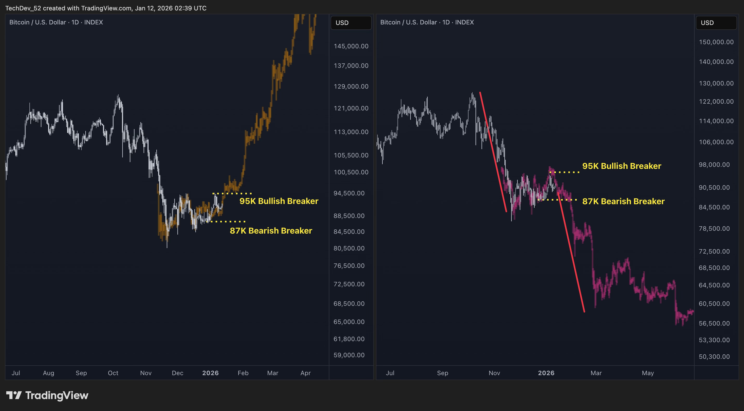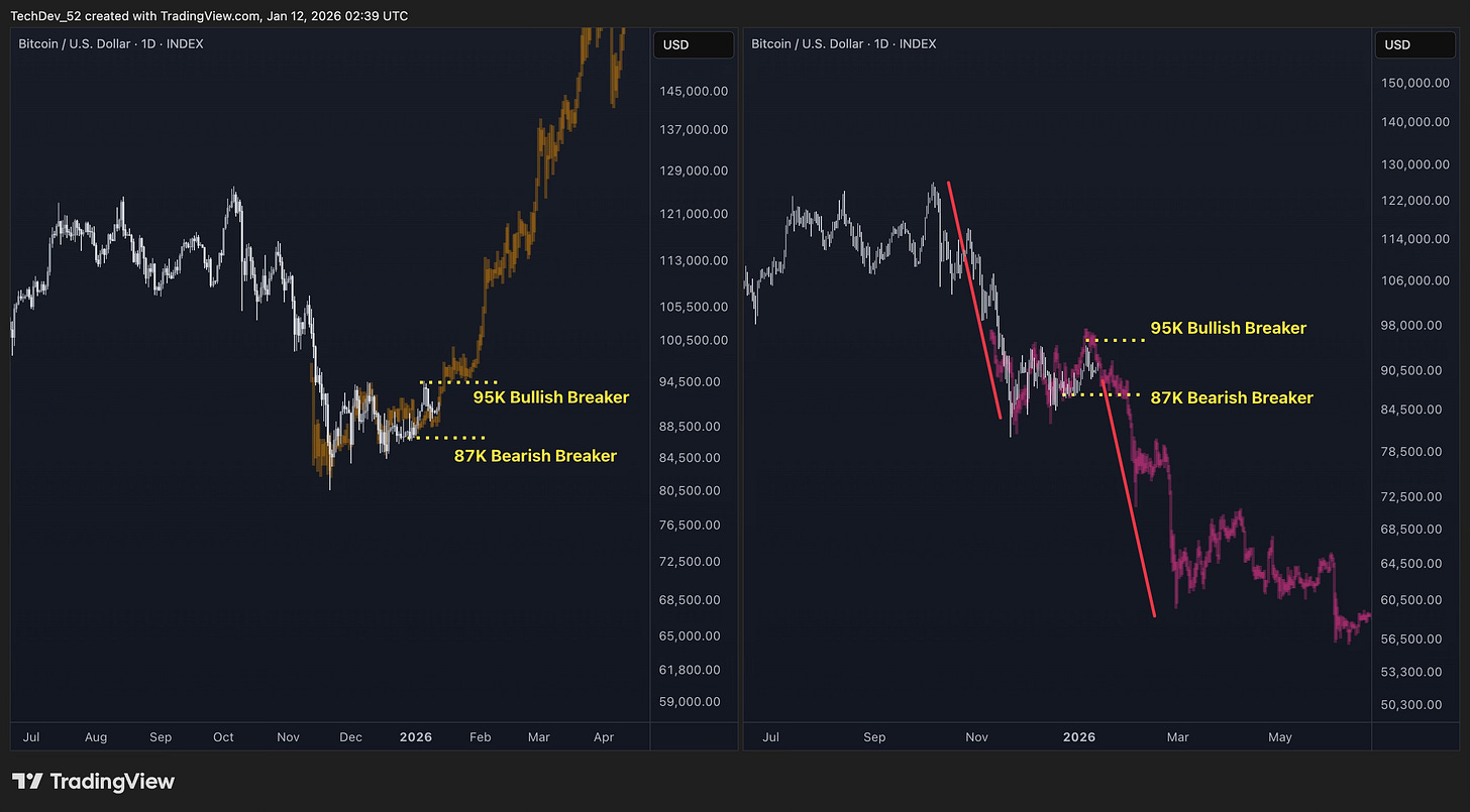 Watch 95K as the bullish breaker. Watch 87K as the bearish confirmation. One of these levels will break first, telling us which scenario is unfolding.