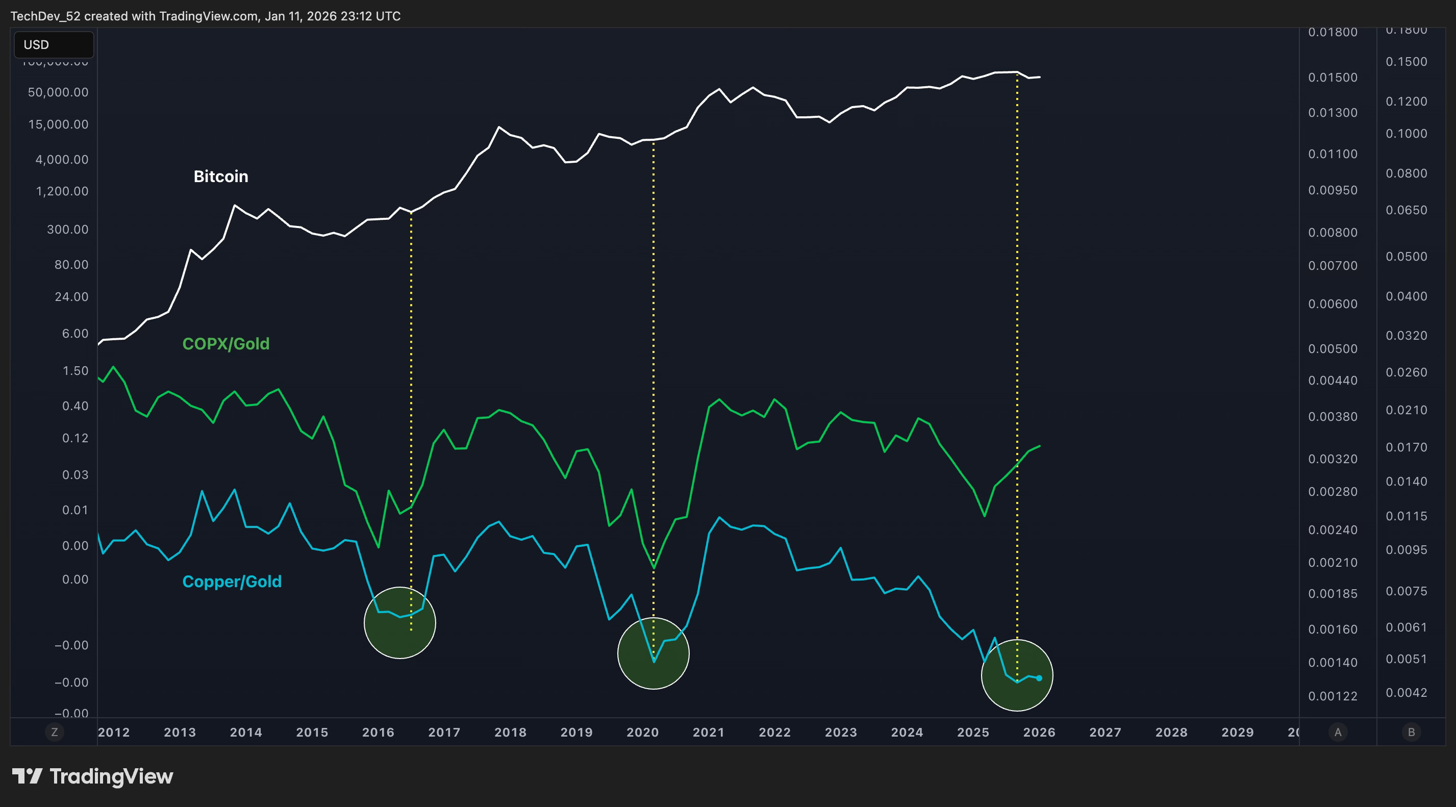 This chart overlays COPX/Gold (copper miners relative to gold) with the Copper/Gold ratio itself, alongside Bitcoin for context. The green circles mark the key inflection points across cycles.