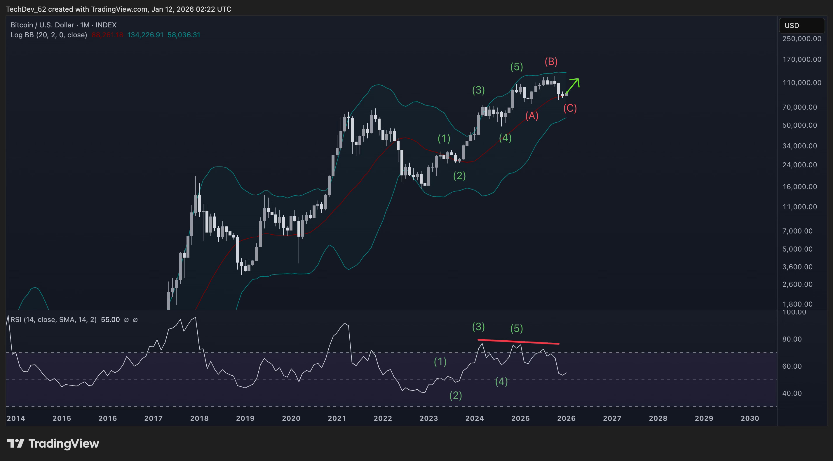 In this first scenario, the (C) wave has already completed, forming what’s called a running flat - where the C-wave terminates above the A-wave low. The Bitcoin/Silver ratio bottoming could be lining up with this correction nearing its end.