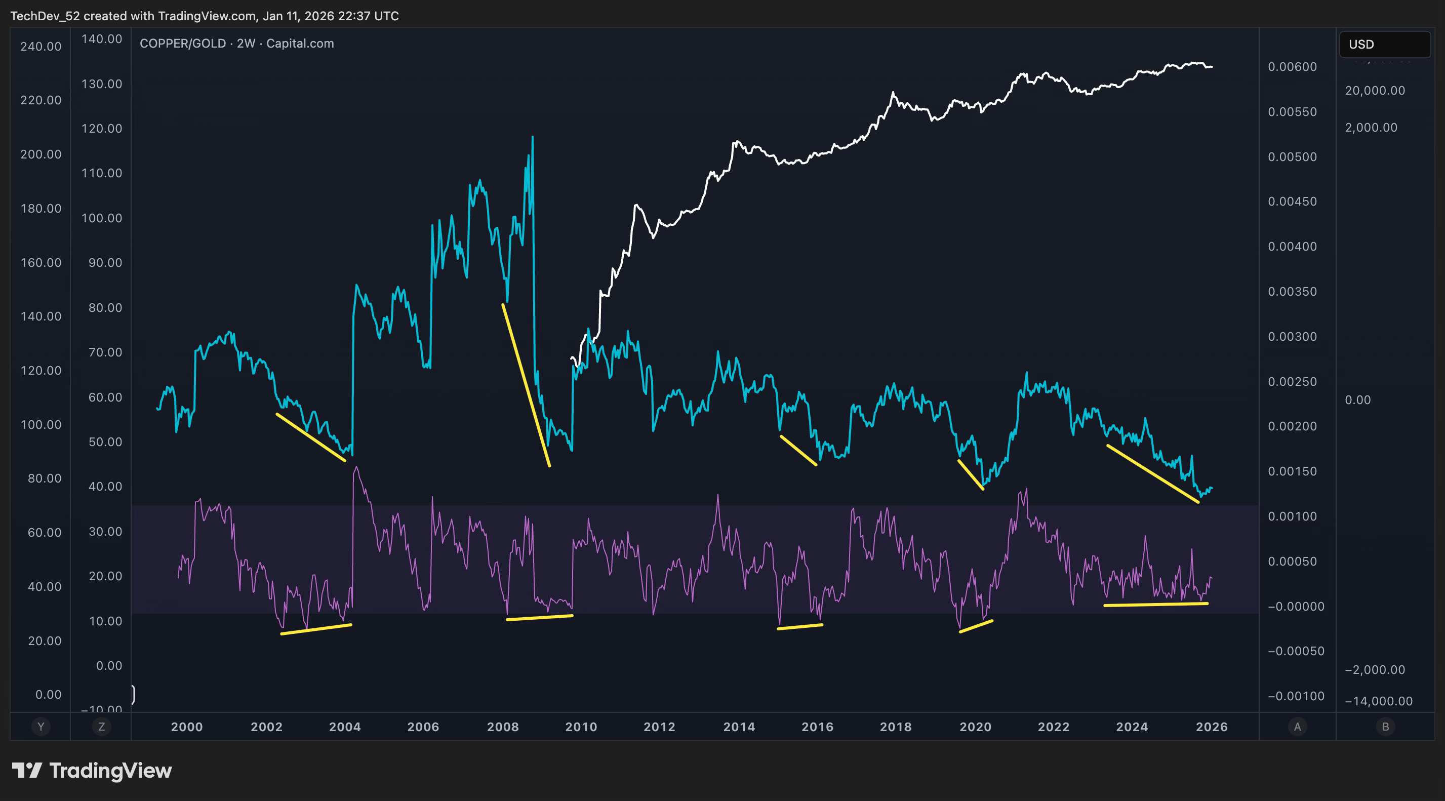 The yellow lines on both the price and RSI panels tell the story. As the Copper/Gold ratio has made lower lows, the RSI has made higher lows. This is textbook bullish divergence - a momentum reversal signal that warns of an impending trend change.