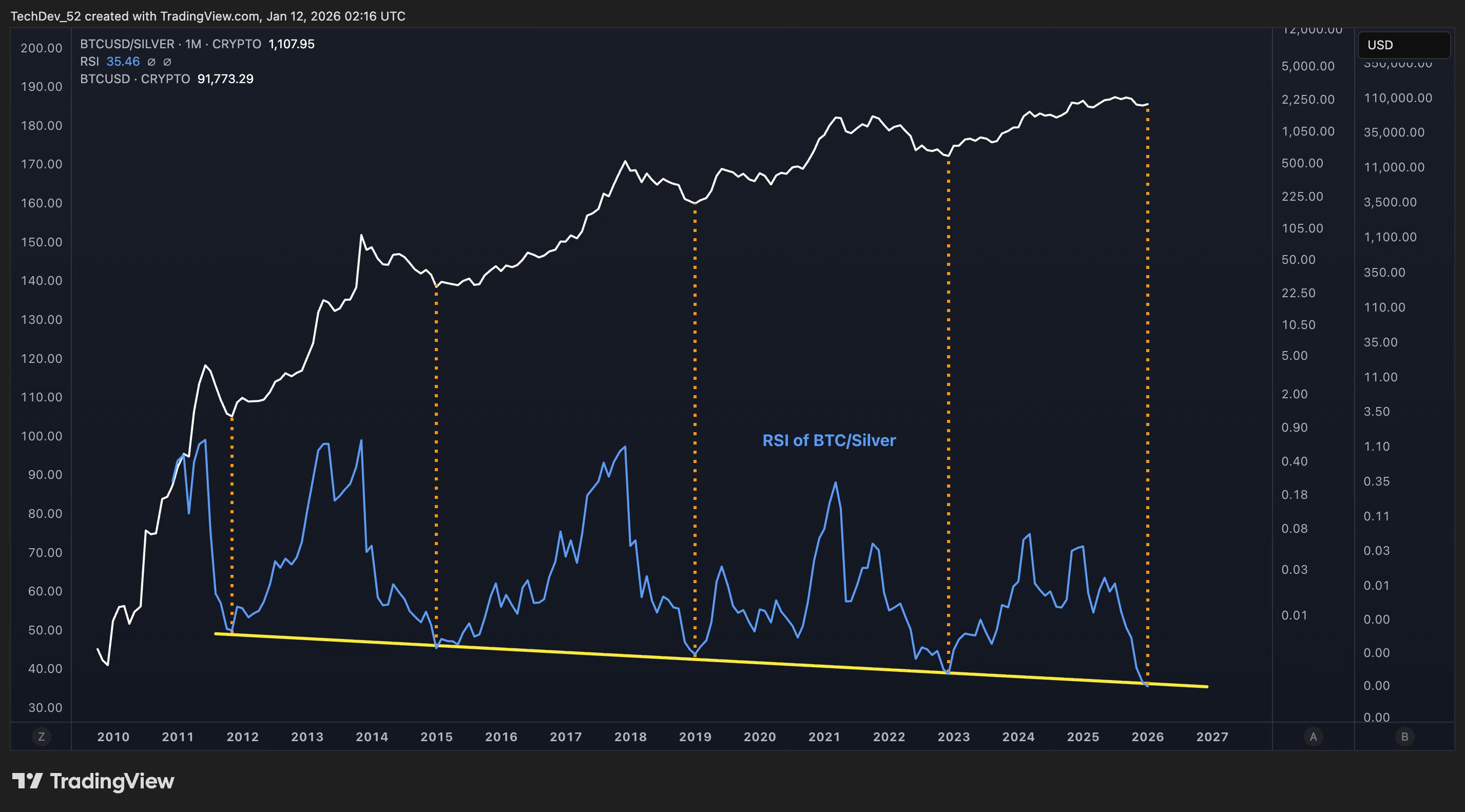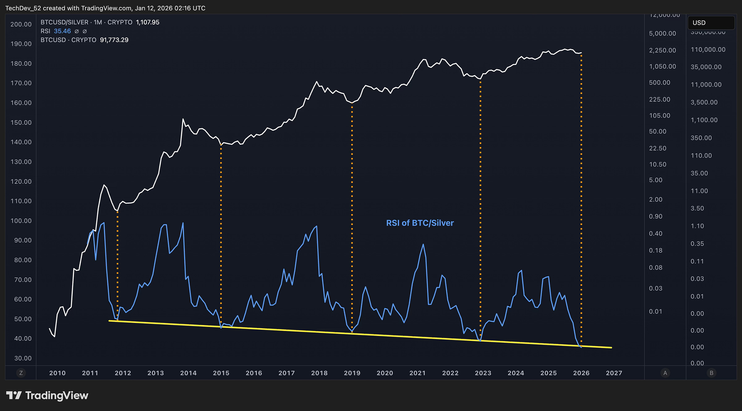 This is the 1-month RSI of the Bitcoin/Silver ratio. The yellow line marks the level that has consistently identified the exact bottoms of every prior bear market in Bitcoin’s history.