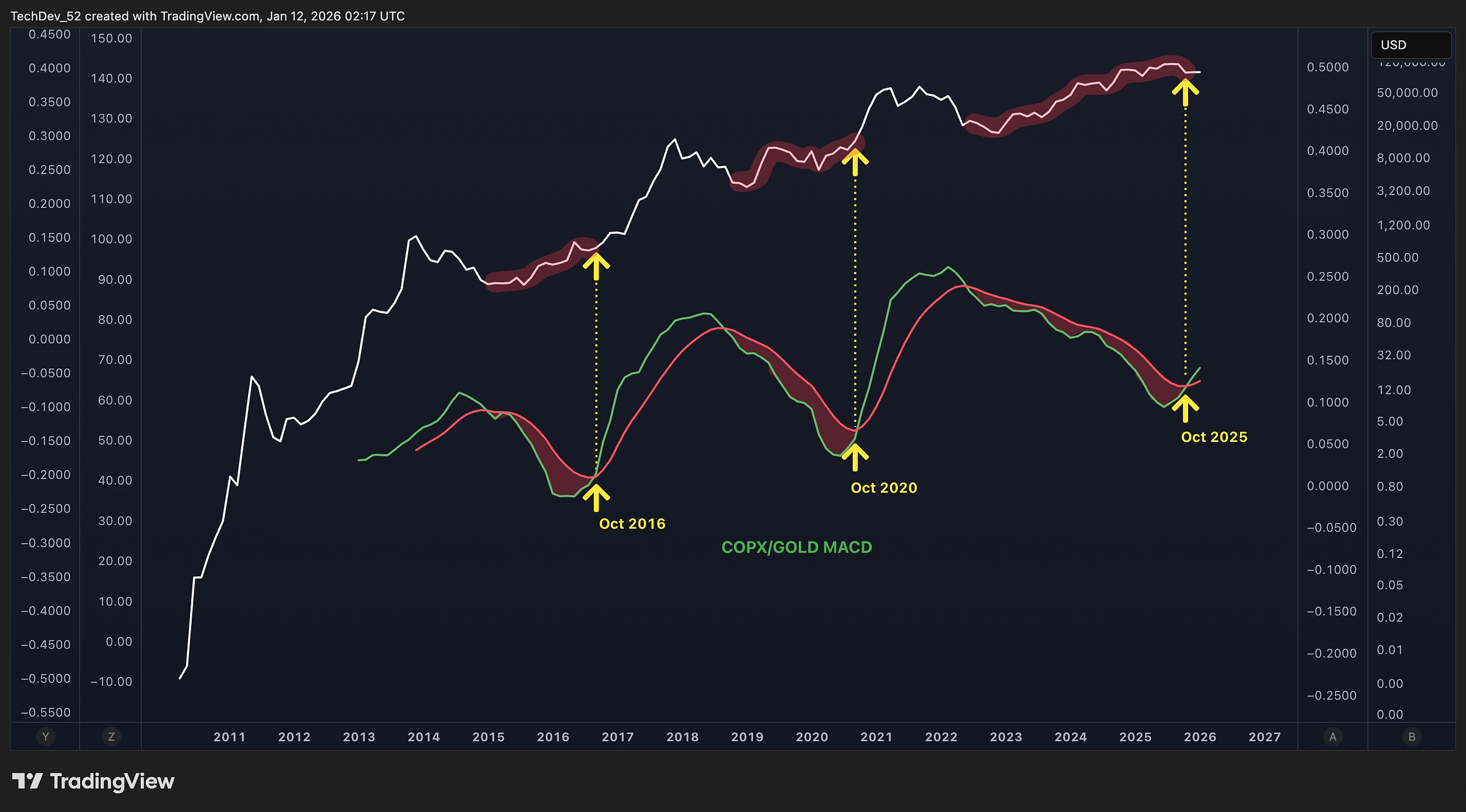 The yellow arrows mark the key moments: October 2016, October 2020, and now October 2025. In each prior instance, the COPX/Gold MACD cross preceded a significant advance in Bitcoin.