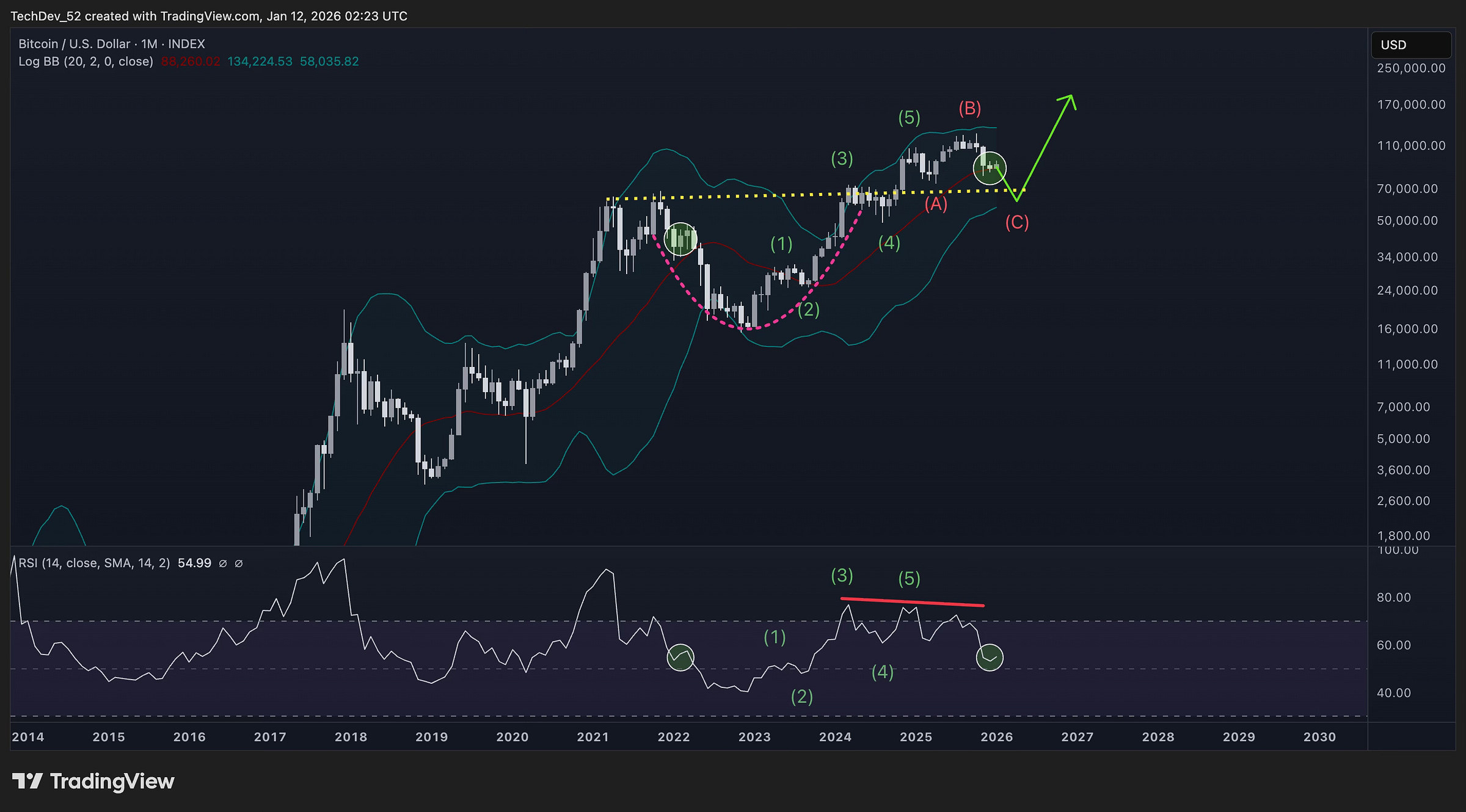 In this case, the (C) wave has another leg down, forming an expanded flat similar to the 2021-2022 structure. The pink path shows what this would look like - a corrective backtest of the macro cup-and-handle neckline before the larger advance begins.